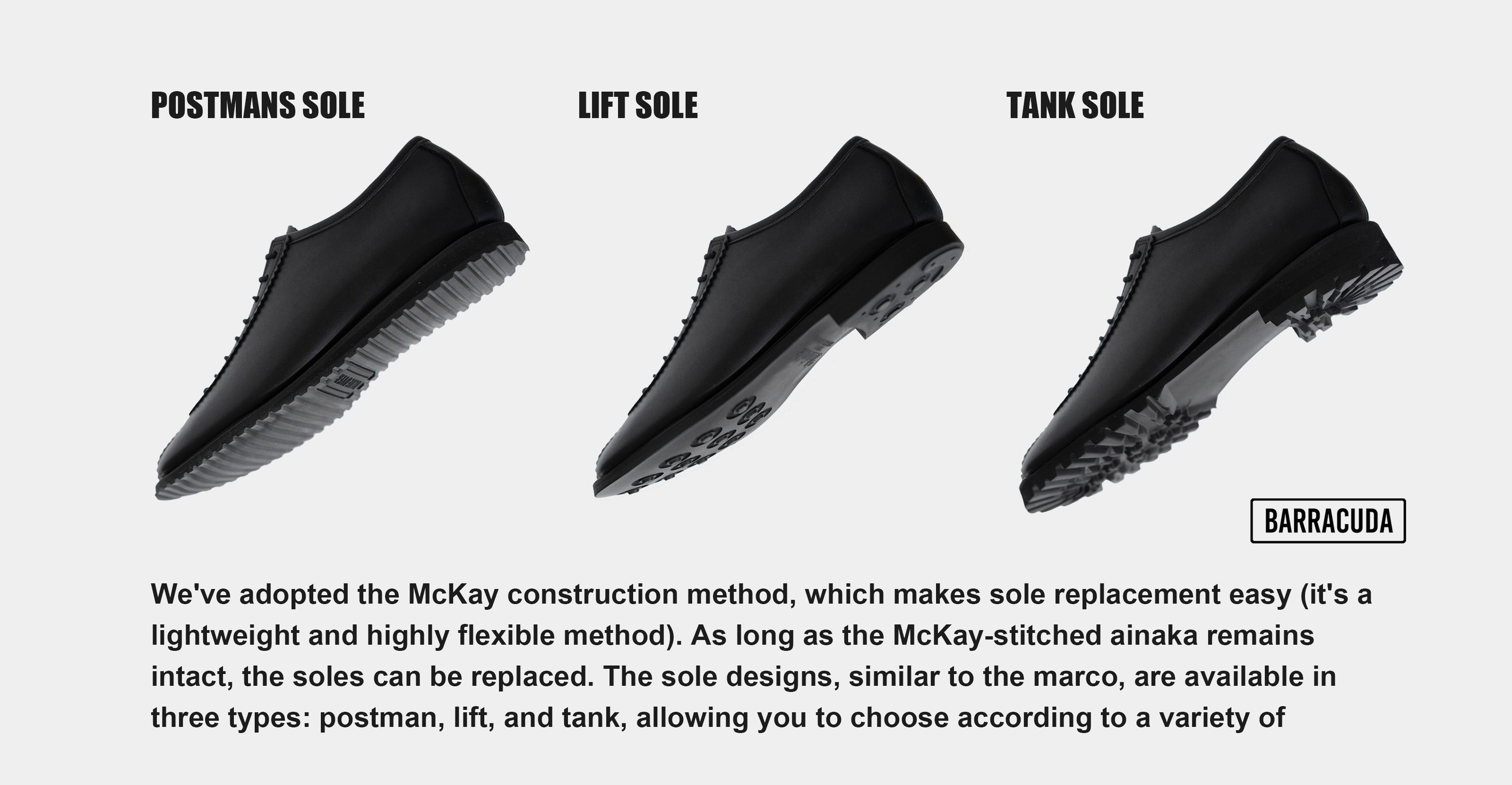 The sole is available in three different designs: postman, lift, and tank. These options can be chosen to suit a variety of situations.